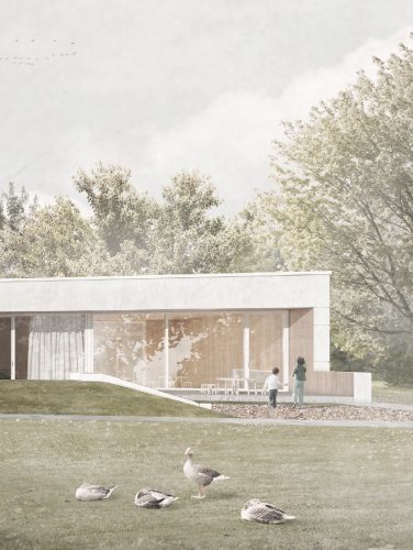 Für den Standort der Bundeswehr-Universität in Neubiberg wurde eine dreizügige Kinderkrippe mit 36 Betreuungsplätzen geplant. Der winkelförmige Körper prägt durch seine unterschiedlichen volumetrischen Charakteristika den Außenraum. Durch Vor- und Rückspringende Zugänge formt er sowohl öffentlichen Raum des Universitätscampus als auch verschiedene Grünbereiche. Die Gruppen- und Schlafräume sind nach Osten zum Garten hin ausgerichtet, um eine ruhige und lichtdurchflutete Umgebung für die Kinder zu schaffen. Diese Räume werden durch eine Versorgungsspange begleitet, die mit einem Querbezug zur Westseite hin aufgebrochen wird, was eine klare und funktionale Erschließung ermöglicht. Im südlichen Vorplatzbereich, nahe dem Haupteingang, befinden sich die Büros der Leitung, Personalräume, die Küche und weitere Nebenräume, die eine effiziente und übersichtliche Organisation sicherstellen. Der Bau erfolgt als Holzmassivbau mit Brettschichtholzelementen, wodurch eine vollständige Vorfertigung möglich ist und die Bauzeit erheblich verkürzt wird. Im Inneren bleiben die natürlichen Holzoberflächen sichtbar und prägen die warme und einladende Atmosphäre der Kinderkrippe. Die Verwendung natürlicher Materialien und die hohe energetische Effizienz sind zentrale Elemente, die ein harmonisches Umfeld für die Betreuung und Entwicklung der Kinder bietet.
